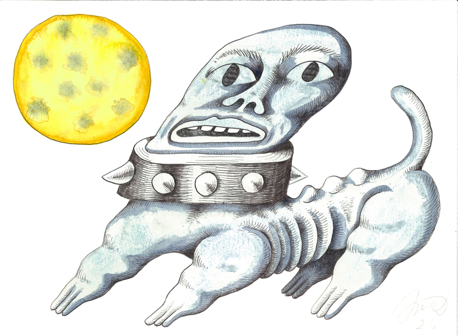 032 - "Human Pug Barking at the Moon" Watercolor Painting by Jim Mooijekind