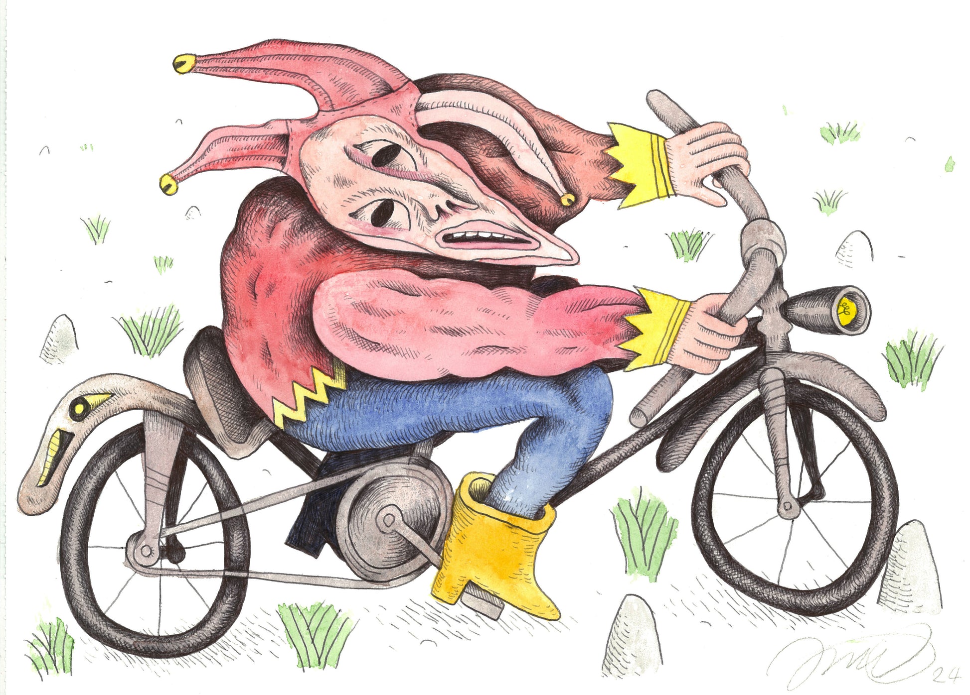 033 - "Jester on Bike" Watercolor Painting by Jim Mooijekind