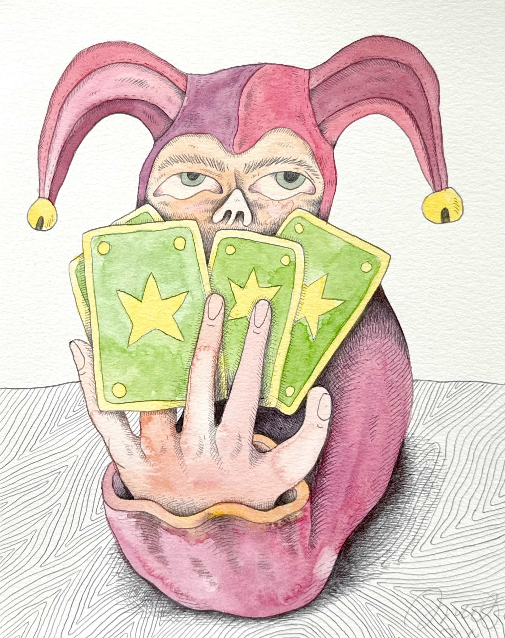 034 - "Joker with Cards" Watercolor Painting by Jim Mooijekind